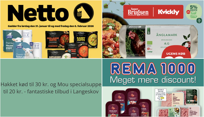 Netto tilbyder Mou specialsuppe i forskellige varianter som Gullasch, Karry, Tomat og Asparges til en pris på kun 20 kr. for 1000 g. Dette tilbud gælder fra lørdag den 31. januar til fredag den 6. februar.